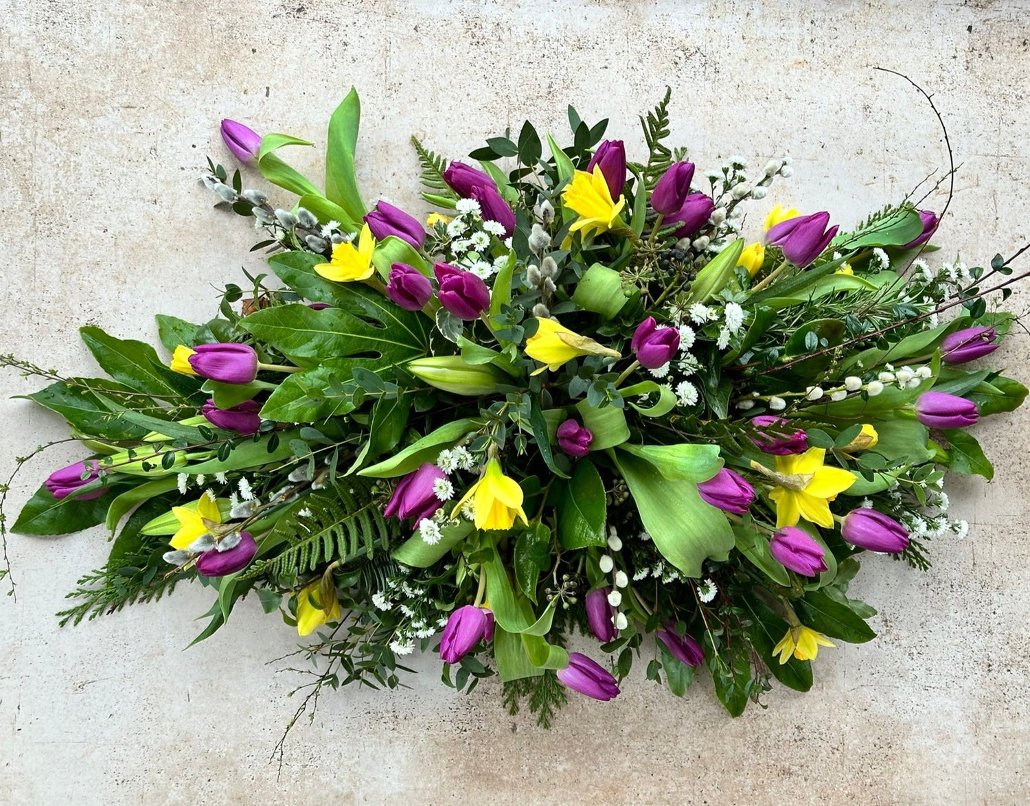 A casket end or side spray showcasing the best of what is in season and British. Each one is individually made using sustainable floristry techniques and celebrates the joys of the season.